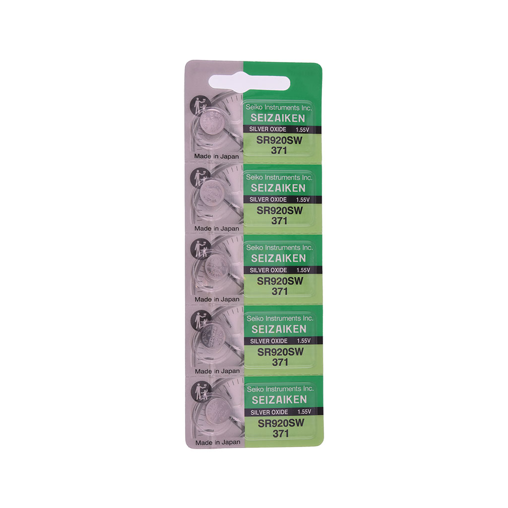 Batería de botón Seiko SR920SW (371) de óxido de plata, diseñada para ofrecer voltaje estable de 1.55V y alto rendimiento en relojes de cuarzo. Su tecnología Low Drain (SW) es ideal para aplicaciones de bajo consumo, garantizando precisión y larga duración. Libre de mercurio (0% Hg) y con excelente resistencia a fugas. Compatible con 371, SR920SW y SR920 (equivalente alcalina: LR920, menor rendimiento).
